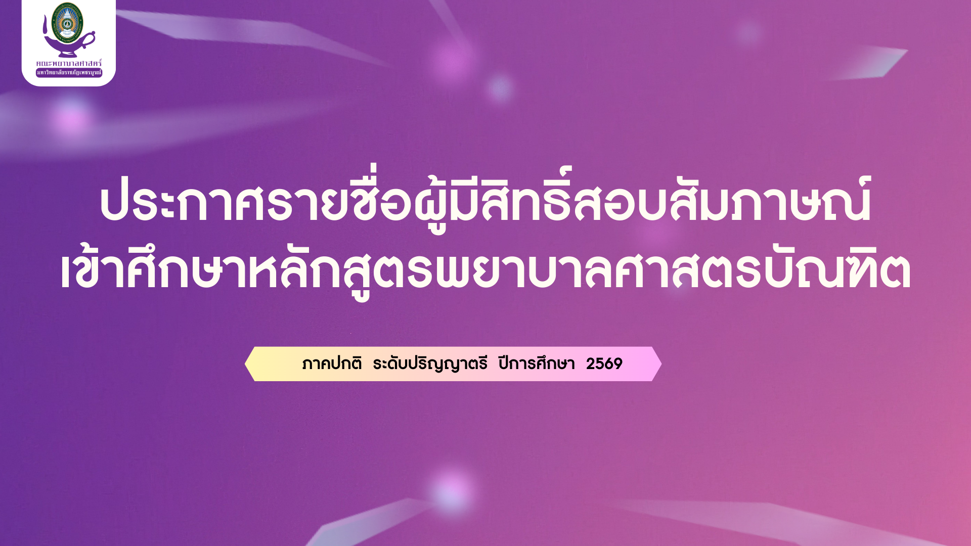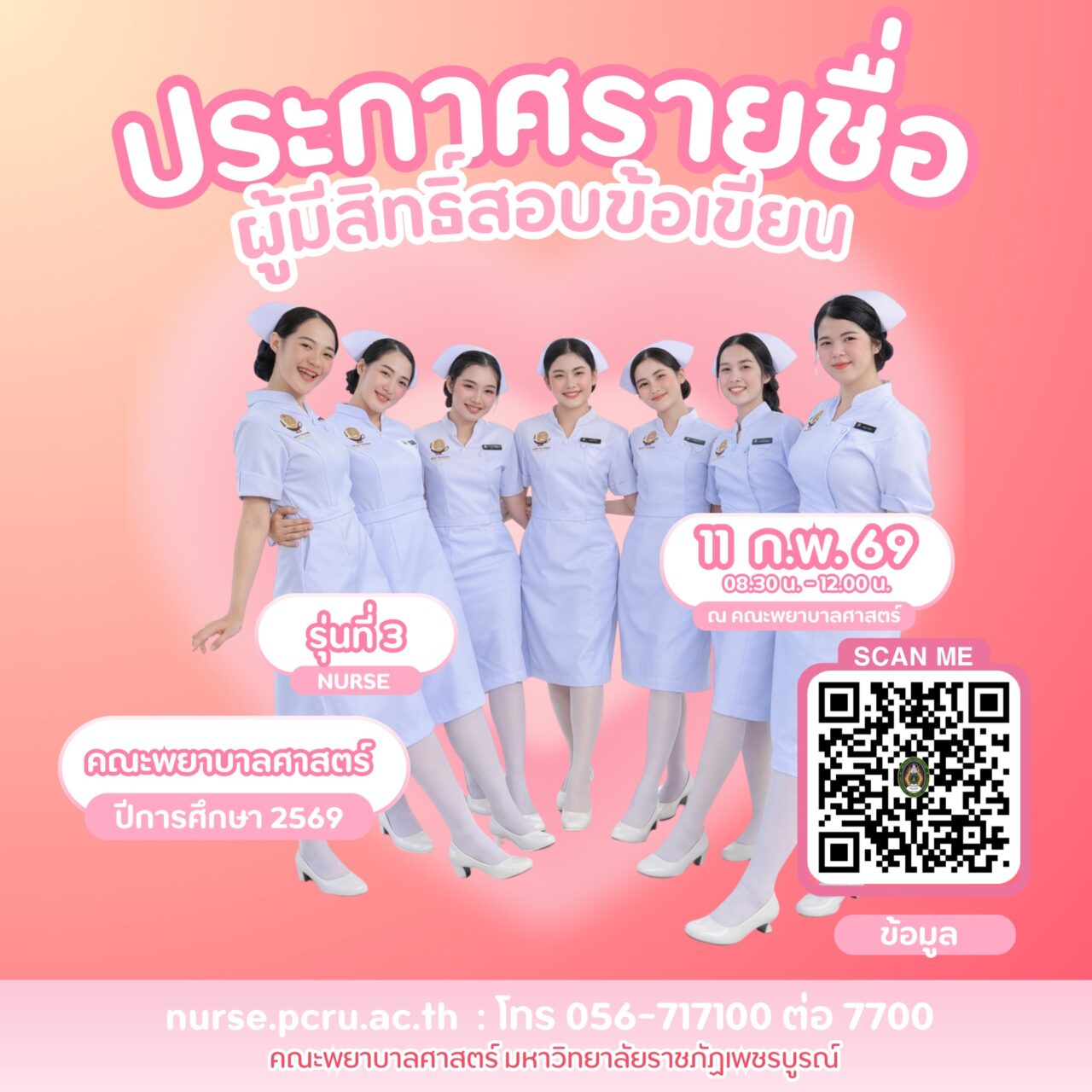 ประกาศรายชื่อผู้มีสิทธิ์สอบคัดเลือกเข้าศึกษา หลักสูตรพยาบาลศาสตรบัณฑิต ภาคปกติ ระดับปริญญาตรี ปีการศึกษา 2569 คณะพยาบาลศาสตร์ มหาวิทยาลัยราชภัฏเพชรบูรณ์ ให้น้อง ๆ ผู้สมัครเข้าศึกษา ตรวจสอบ รายชื่อผู้มีสิทธิ์สอบ ห้องสอบ ลำดับที่นั่งสอบ ได้ที่ลิงก์ด้านล่างนี้
