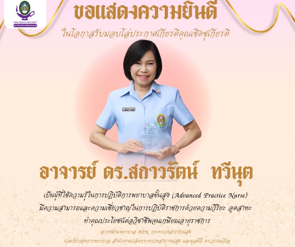 คณะพยาบาลศาสตร์ ขอแสดงความยินดีกับ อาจารย์ ดร.สกาวรัตน์ ทวีนุต ในโอกาสรับมอบโล่ประกาศเกียรติคุณ เพื่อแสดงว่า เป็นผู้ที่ใช้ความรู้ในการปฏิบัติการพยาบาลขั้นสูง (Advanced Practice Nurse) มีความสามารถและความเชี่ยวชาญในการปฏิบัติราชการด้วยความวิริยะ อุตสาหะ ทำคุณประโยชน์ต่อวิชาชีพจนเกษียณอายุราชการ จากชมรมพยาบาล APN […]