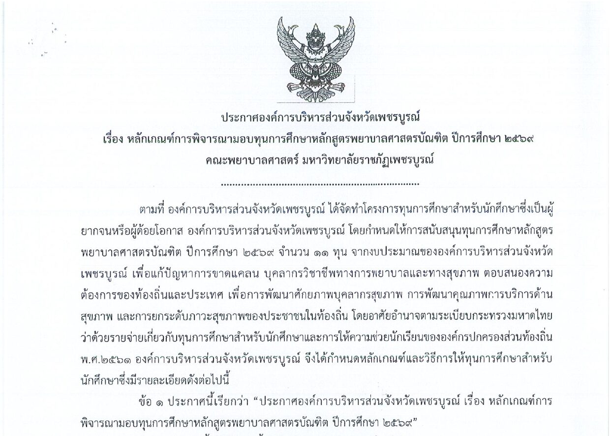 ประกาศองค์การบริหารส่วนจังหวัดเพชรบูรณ์ เรื่อง หลักเกณฑ์การพิจารณามอบทุนการศึกษาหลักสูตรพยาบาลศาสตรบัณฑิต ปีการศึกษา 2569 คณะพยาบาลศาสตร์ มหาวิทยาลัยราชภัฏเพชรบูรณ์ รายละเอียดเพิ่มเติม : https://www.phetchabunpao.go.th/…/doc54870501_merged.pdf